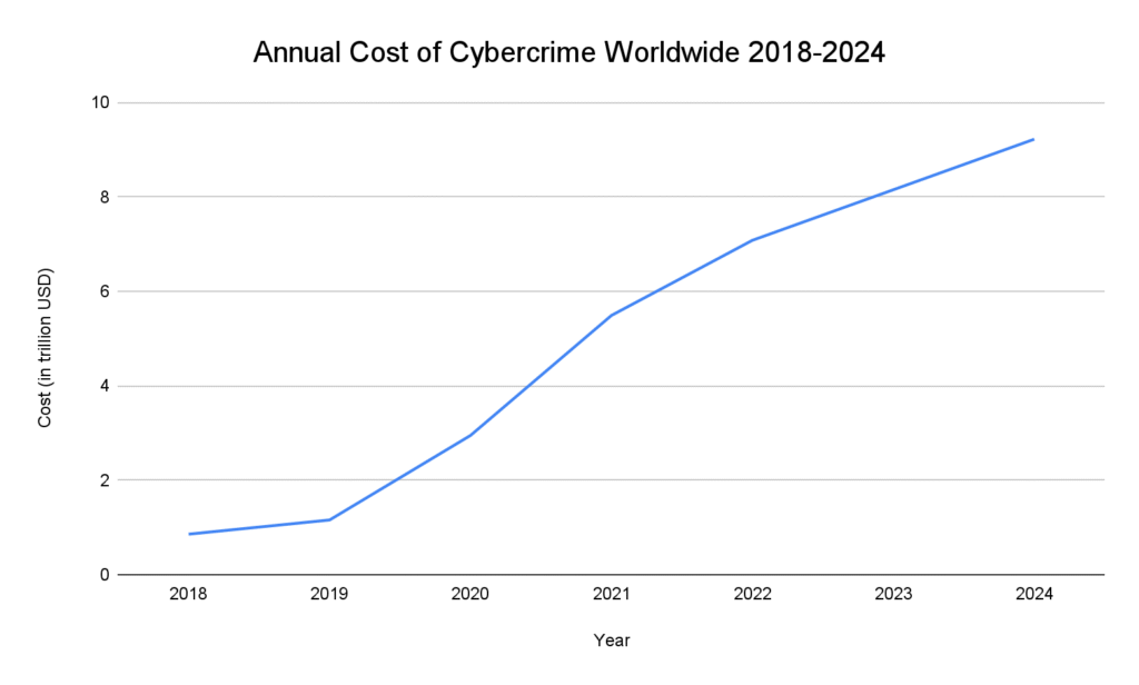 - The global cost of cybercrime in 2024 was estimated to be between $9.22 trillion and $9.5 trillion